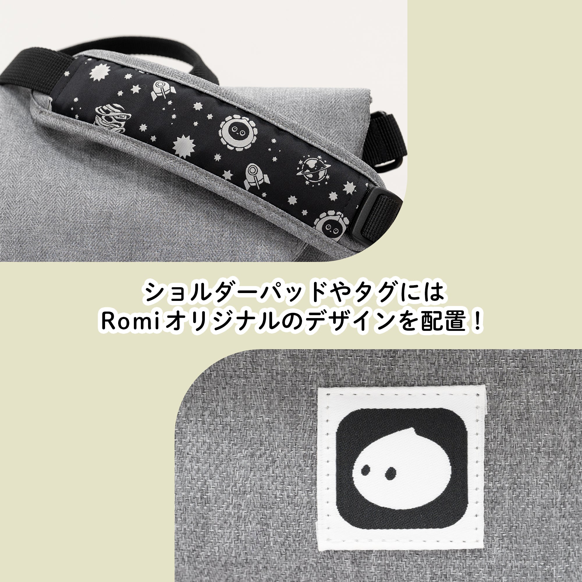 ショルダーパッドやタグにはRomiオリジナルのデザインを施しています。