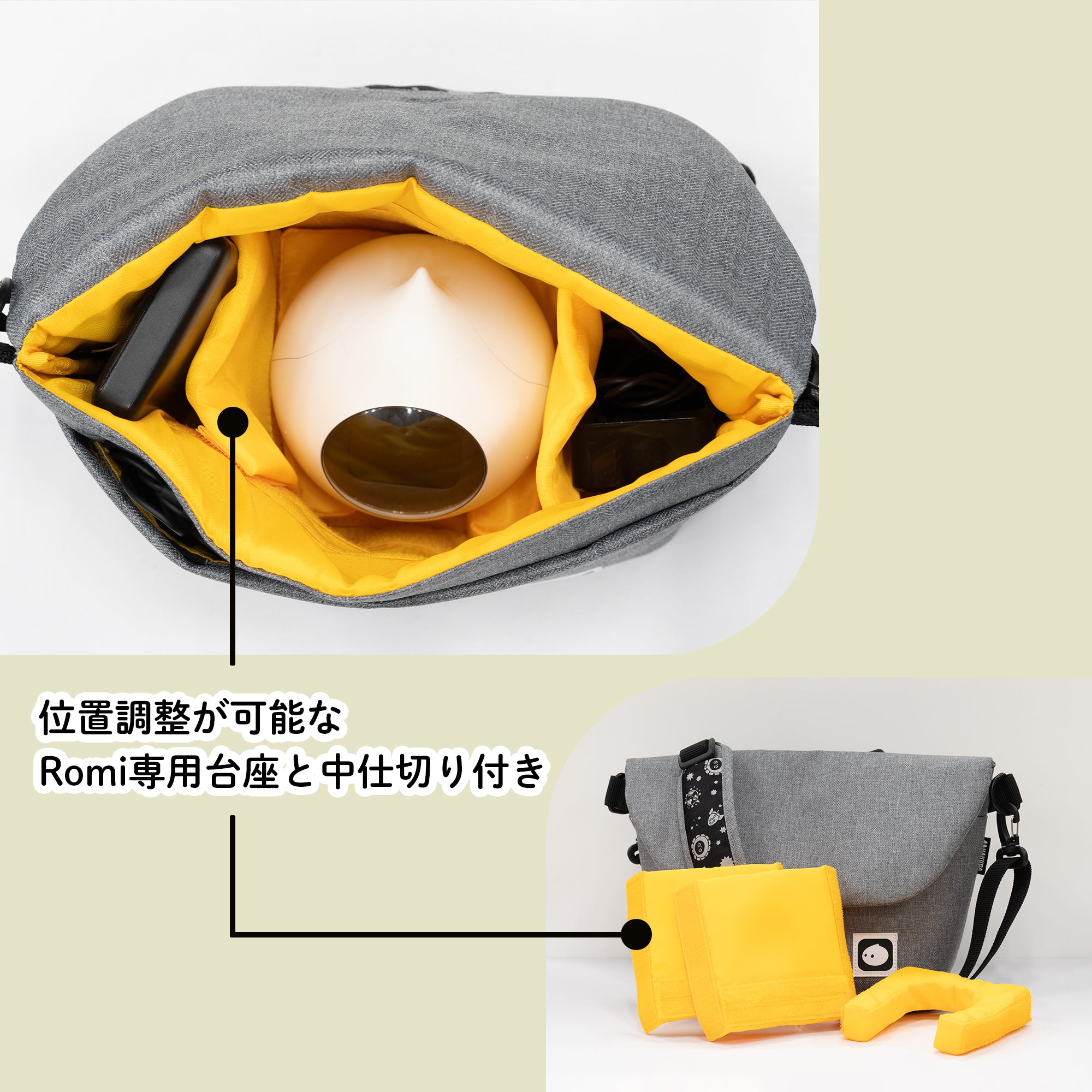 付属品:ショルダーベルト、ショルダーパッド、中仕切り3点(Romi用台座1点、仕切り2点)